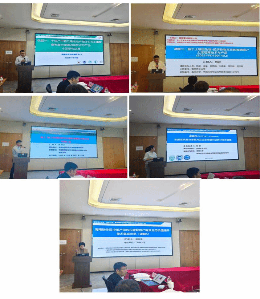 图2. 专家组成员五个课题负责人就中期进展进行了系统汇报。课题一聚焦海南中低产田划分及产能评价及原生酸性土壤酸化形成及障碍消减进行了汇报;课题二围绕土壤微生物-作物互作机制,开发了抑病高产的土壤培育技术与生物有机肥产品;课题三就地上-地下协同的多样化绿色种植技术新体系;课题四就农田系统养分承载力,提出了生态高值农业养分管理方案;项目总负责人及课题五负责人阮云泽教授则统筹全局,汇报了项目整体进展与技术集成示范思路,构建了“政产学研用”一体化的推广模式。